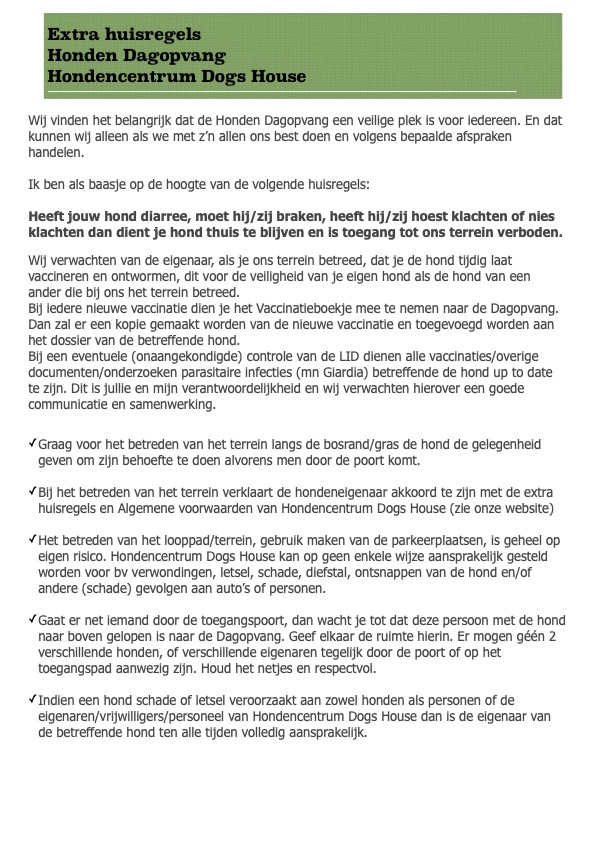 We plannen een proefdag waarop je hond een dag met ons meeloopt. Wij controleren het vaccinatie boekje en maken daar kopieën van. Tijdens deze dag begeleiden en observeren wij je hond en/of de hond goed past binnen de roedel en zich prettig voelt in onze omgeving. Dit is geen garantie dat de hond zich ook in de toekomst goed in de groep voelt en positief sociaal gedrag blijft vertonen. Mocht dit veranderen dan gaan wij daarover met jullie in gesprek.