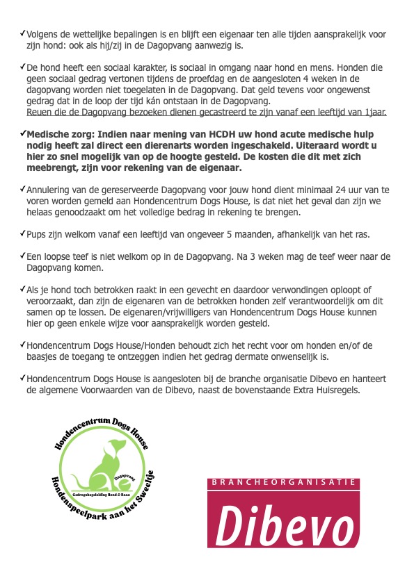 Zou je graag jouw hond een geweldige dag gunnen, of heb je een drukke baan? Het maakt eigenlijk niet uit wat de reden is, jouw hond is meer dan welkom in de dagopvang. Jouw hond ervaart bij ons sociale interactie tussen en met soortgenoten op een positieve manier met continu begeleiding van professionals! Bij Dogs House beleeft jouw hond een heerlijke dag vol beweging, plezier en ontspanning met natuurlijk veel aandacht.